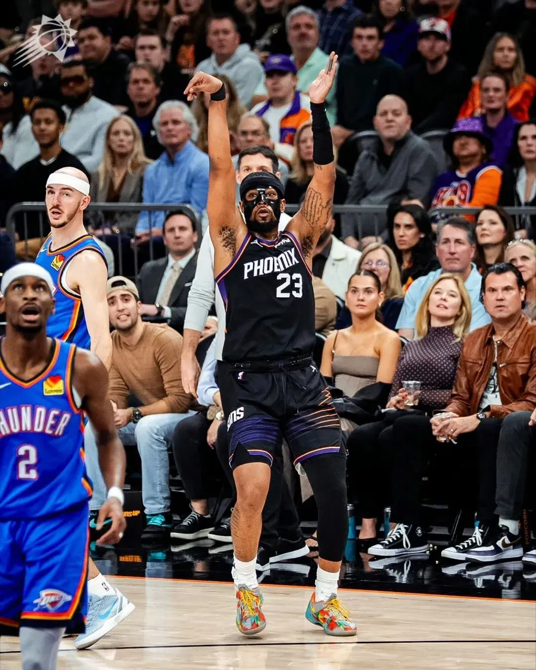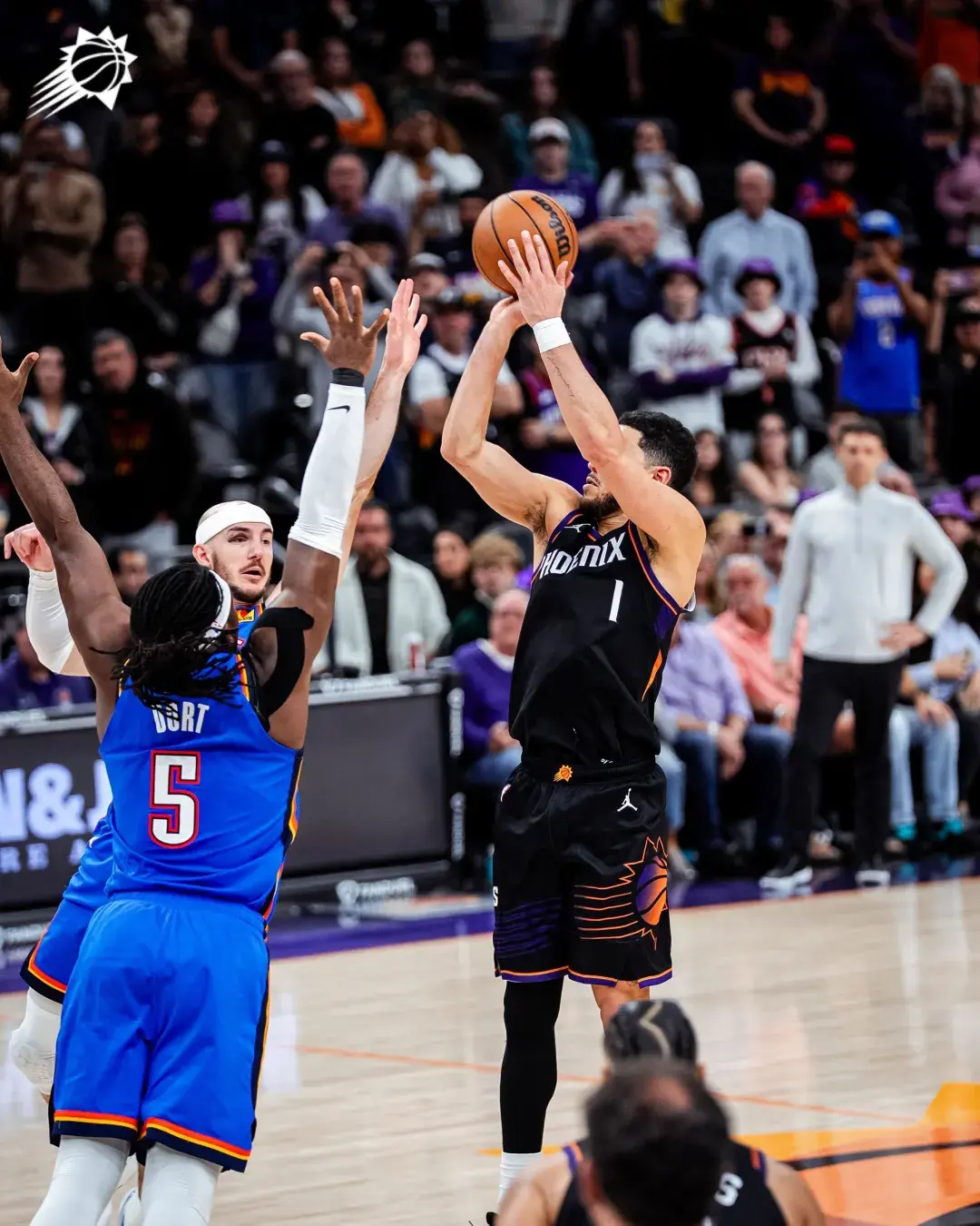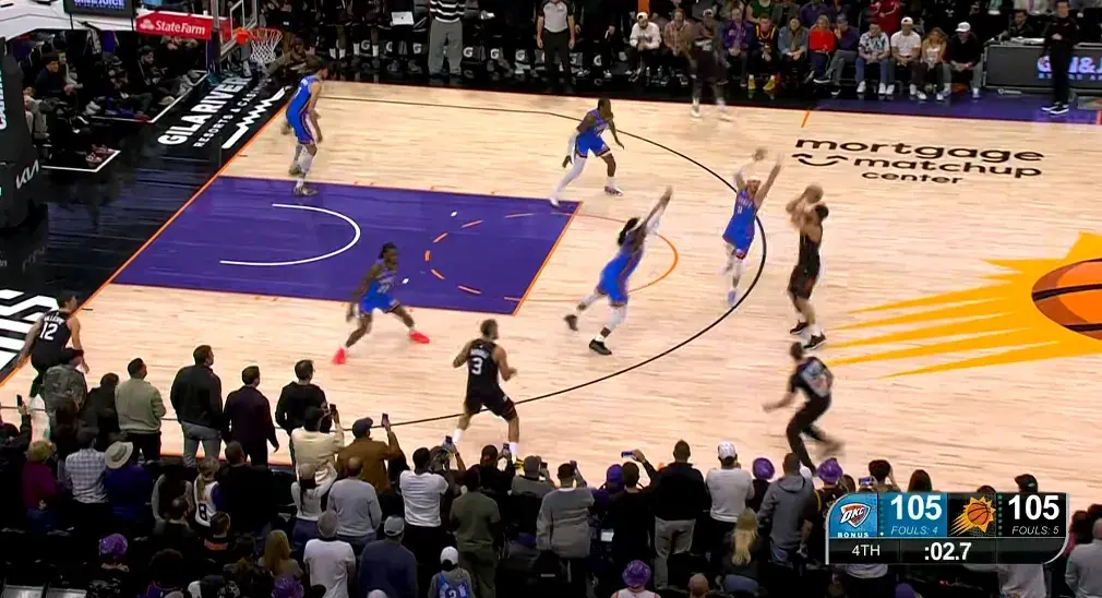 太阳此时场上五个人都有投三分的能力,雷霆没有轻易选择包夹,多尔特在布克的突破路线上等待。布克观察了一下局势,佯装左侧突破,随后撤步三分出手,在多尔特和卡鲁索这对让联盟闻风丧胆的防守组合面前,投进绝杀三分!