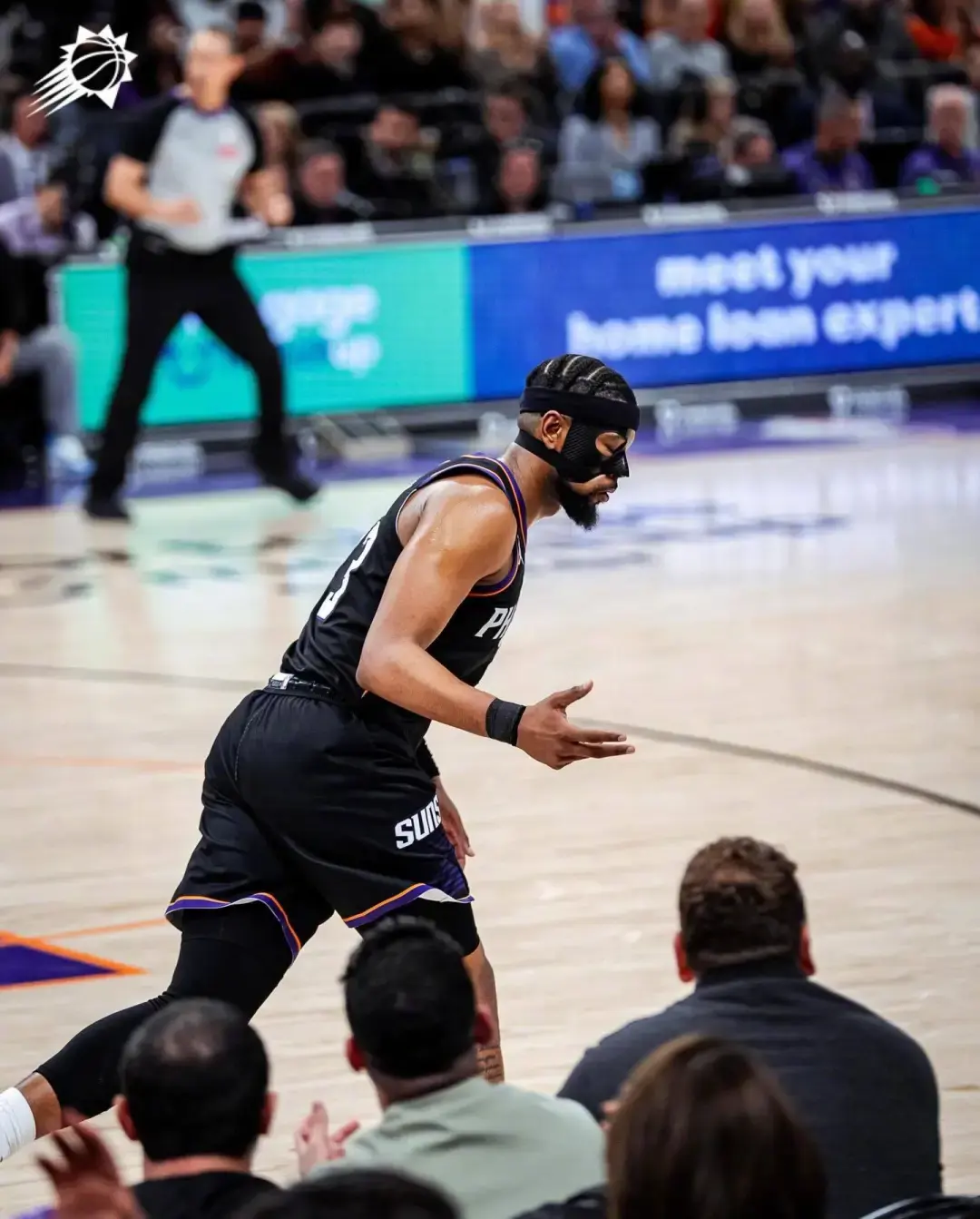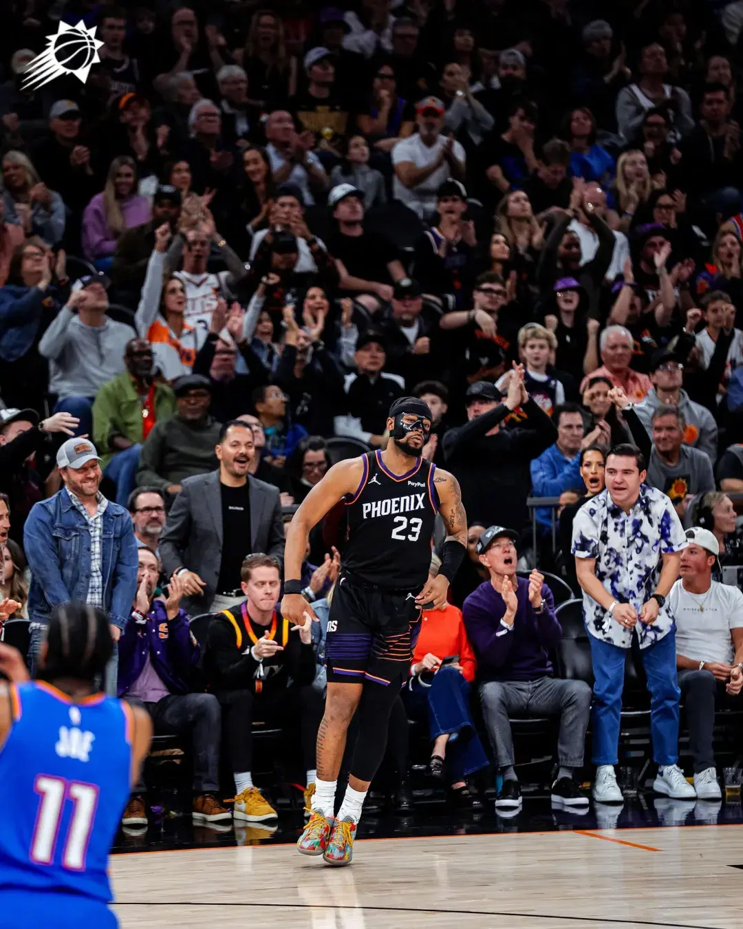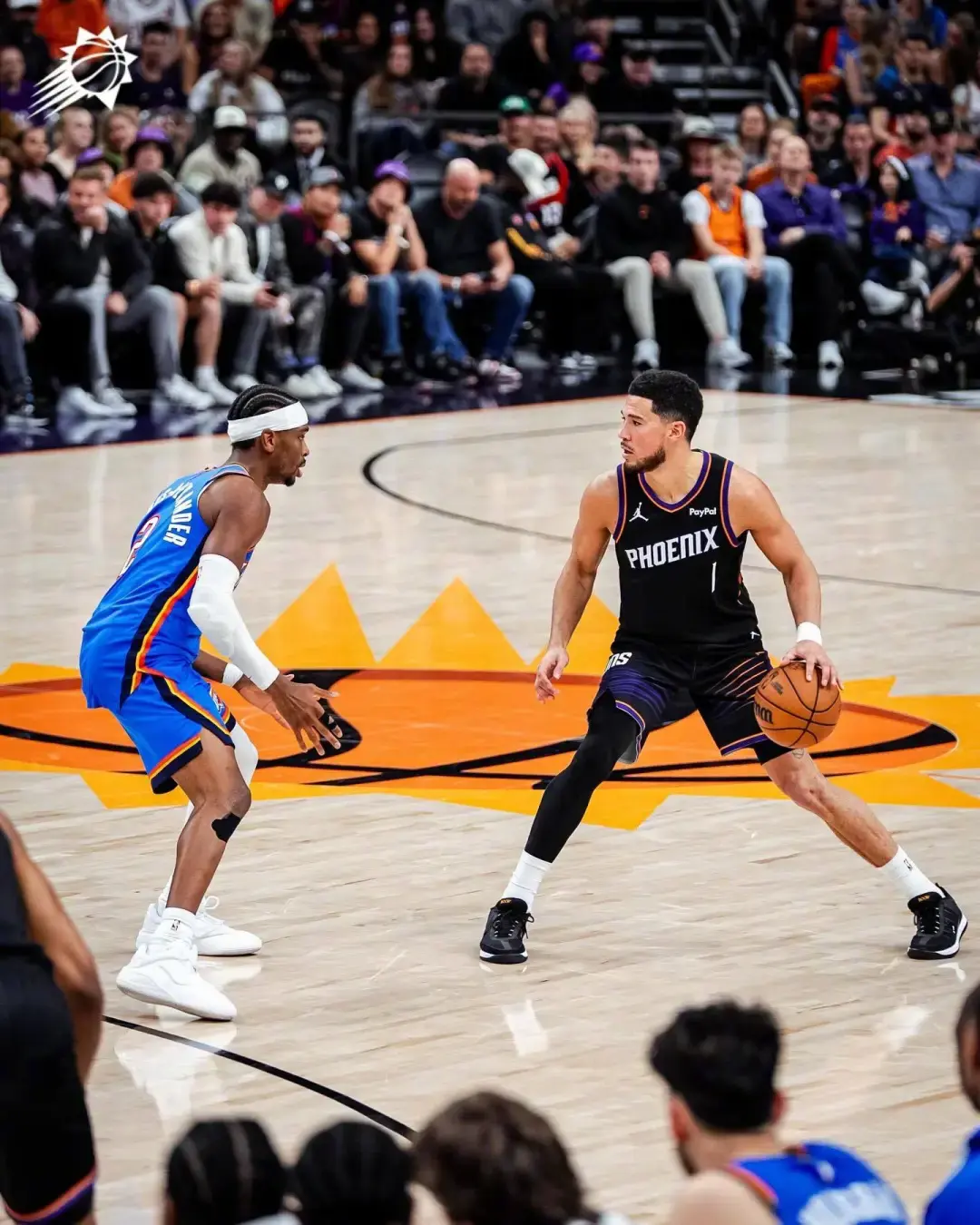 太阳此时场上五个人都有投三分的能力,雷霆没有轻易选择包夹,多尔特在布克的突破路线上等待。布克观察了一下局势,佯装左侧突破,随后撤步三分出手,在多尔特和卡鲁索这对让联盟闻风丧胆的防守组合面前,投进绝杀三分!